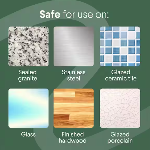 This cleaner is safe to use on surfaces including glazed and unglazed ceramic tile grout vinyl fiberglass and plastic and wont leave a dull residue
